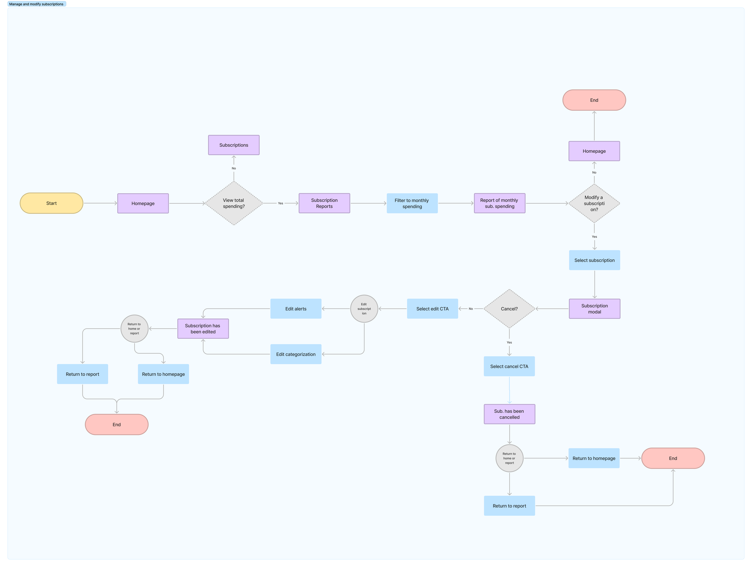 Using Figma, I designed user flows to manage and modify subscriptions (seen below) and create a subscription alert.