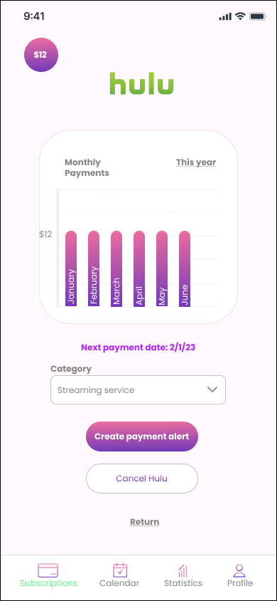 I conducted two rounds of remote usability testing, presenting tasks that included cancelling a subscription, recategorizing a subscription, and creating a recurring payment notification. In this initial round , users had a difficult time locating the filter icon, searching for a specific subscription, and identifying the correct CTA for specific tasks. Before the second round, I improved the icons’ and CTAs’ visibility and recognizability and made sure that the top search bar was available on all pages.